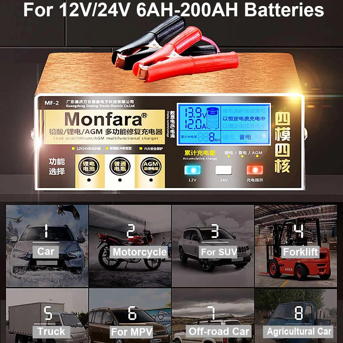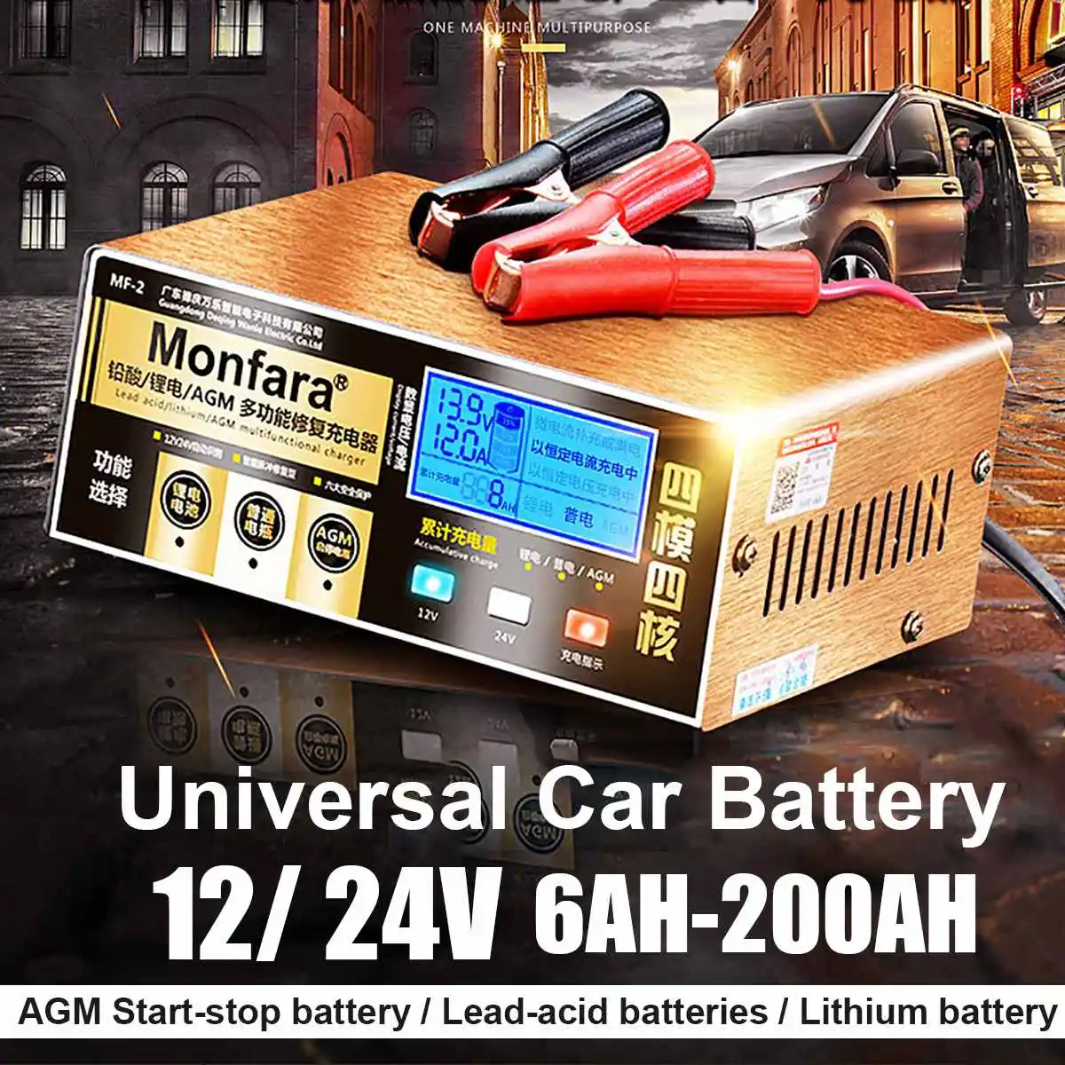 12V/24V 200AH Electric Car Dry Wet Battery Charger Automatic Intelligent Pulse Repair Type Car Jump LCD Display