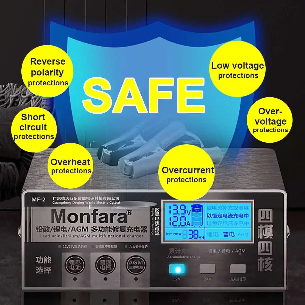 12V/24V Lead Acid Battery PWM US Plug Car Battery Charger Applicable to Five Charging Modes Digital Pulse Repairing Method